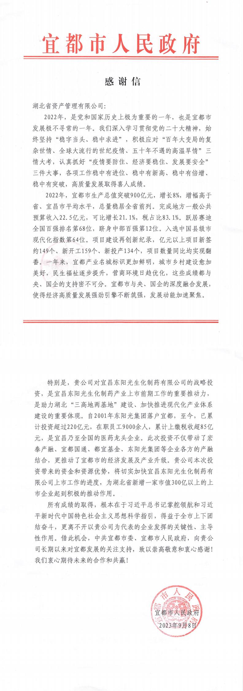 近日,湖北省資產(chǎn)管理有限公司收到宜都市人民政府發(fā)來(lái)的感謝信。2023年,為支持地方企業(yè)發(fā)展和現(xiàn)代化產(chǎn)業(yè)體系建設(shè),助力湖北“三高地兩基地”建設(shè),湖北瑞珩資產(chǎn)管理有限公司在母公司湖北省資產(chǎn)管理有限公司的正確領(lǐng)導(dǎo)下,積極響應(yīng)湖北省委、省政府戰(zhàn)略部署,全面貫徹新發(fā)展理念,以“化解金融風(fēng)險(xiǎn),服務(wù)產(chǎn)業(yè)發(fā)展”為使命,有力服務(wù)于全省“51020”現(xiàn)代產(chǎn)業(yè)體系。通過(guò)資源整合為宜昌東陽(yáng)光生化制藥有限公司注入新的資金,幫助企業(yè)降低融資成本,優(yōu)化融資結(jié)構(gòu),做大資產(chǎn)規(guī)模,提升企業(yè)估值,助力企業(yè)上市。此次合作帶動(dòng)了企業(yè)之間產(chǎn)業(yè)融合,有力地支持了企業(yè)在上市前期遇到的資金困難,充分發(fā)揮了湖北資管主責(zé)主業(yè)優(yōu)勢(shì),切實(shí)加快了宜昌東陽(yáng)光生化制藥有限公司上市工作的進(jìn)度。